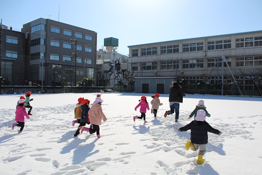 そんな雪を見ると、ついつい走り出してしまう子どもと先生です。