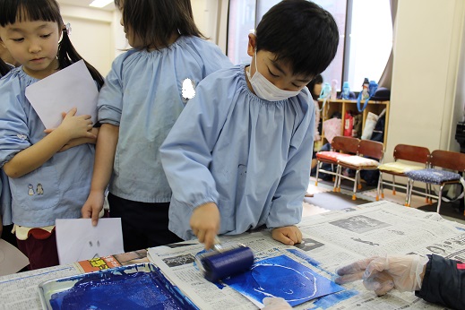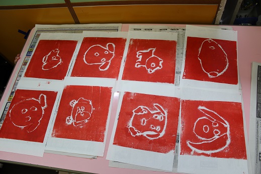 年長組は昨日の続きをするということでしたが、部屋に行ってみると昨日作った「犬」の上にローラーでインクをつけていました。