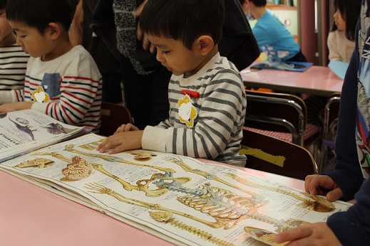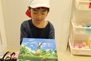 中には図鑑やら、大型えほんを借りてくる子もいました。戻ってくると、早速自分で選んで借りてきた本を見せ合う姿がみられました。中にはおりがみや手芸の本を借りてきた子も。ご自宅でゆっくり楽しんでいただき、期日中に図書館に返却をしてくださいね。