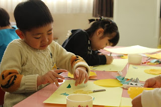 折り紙に自分で鉛筆でラインを引き、ハサミで切っています。