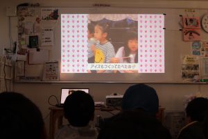 まずはかつてのクラスで話をし、2クラス一緒に在園中の写真などを見ました。