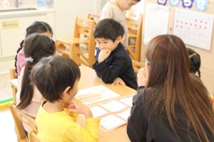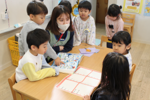 今日年中組では、先生と数人で机を囲んでいます。近づいて見るとみんな真剣な表情。