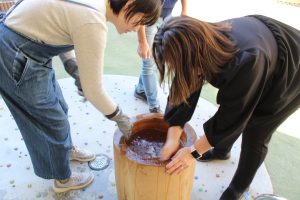 金曜日は幼稚園のおもちつきです。それに向けて、臼や杵を洗い、水を張る作業などを行いました。