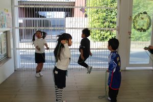 縄跳びを友達と励まし合って練習する子