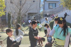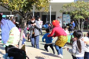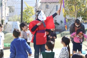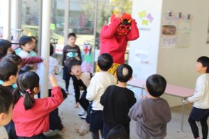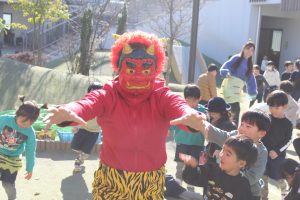 まずは年少組、続いて年中、年長の子達の豆まきでした。それぞれの学年で鬼のレベルを考えました。