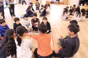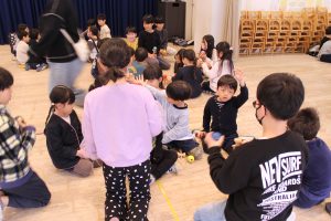 今日は、大豆戸小学校の4年生が幼稚園に来て、年長組と一緒にけんだまをして楽しみました。
